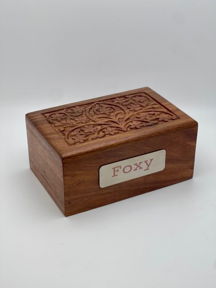 Pet Memory Box, Pet Urn for Ashes, Rosewood with Floral Carved Design in Natural Reddish-Brown Wood Color